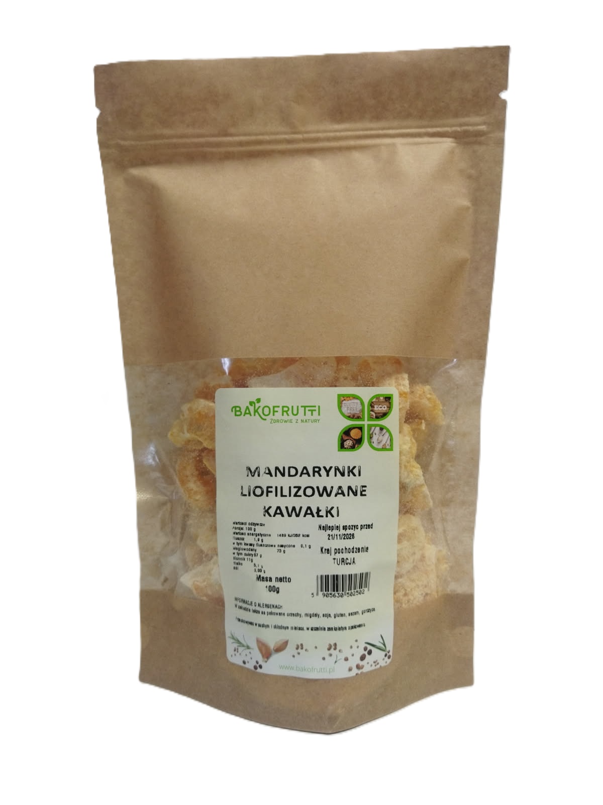 Jak powstaje: Liofilizacja (suszenie mrozem) polega na zamrożeniu świeżych owoców i odparowaniu wody w próżni. Dzięki temu mandarynki zachowują smak, aromat, barwę i większość składników odżywczych, a jednocześnie stają się lekkie i chrupiące.