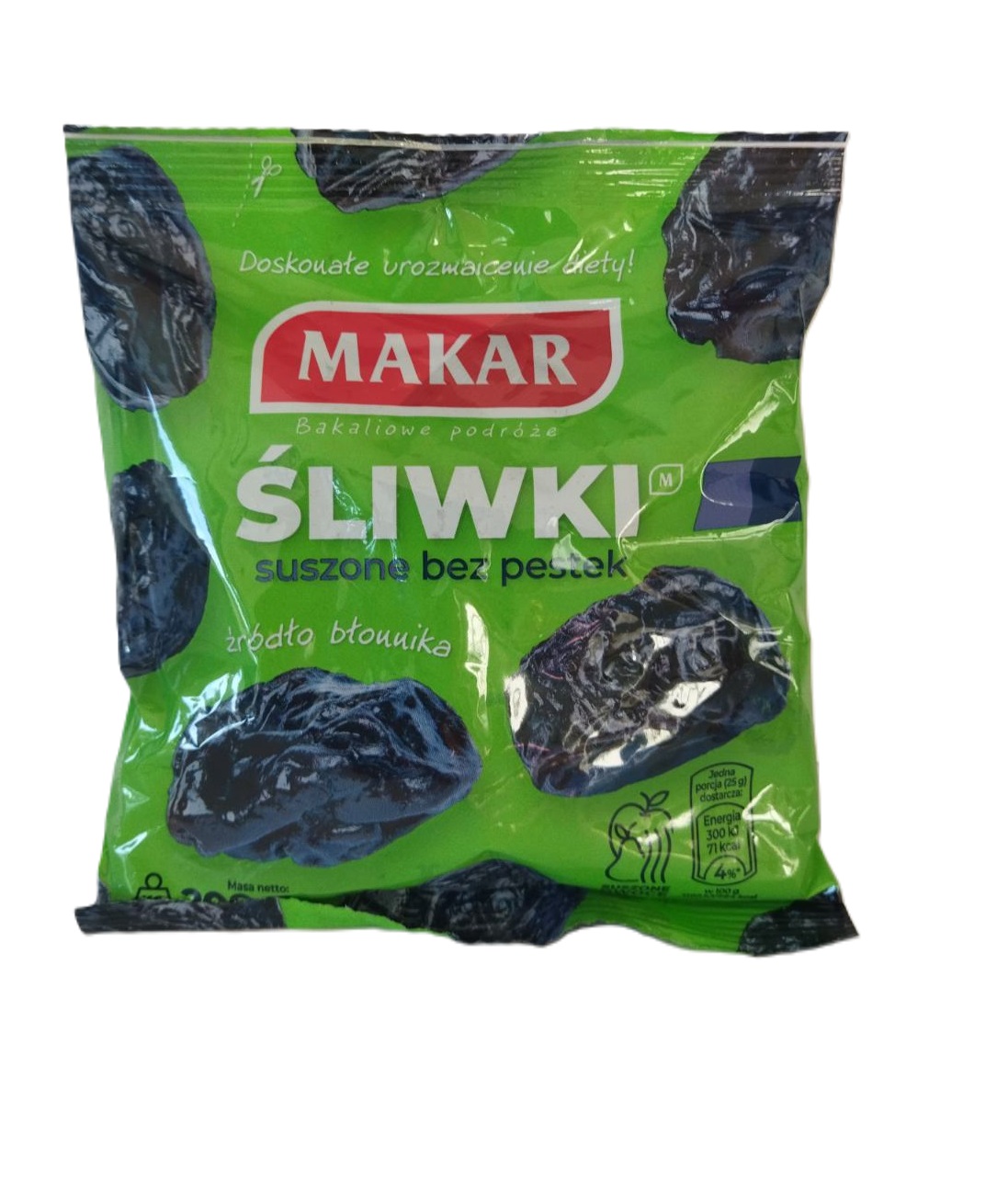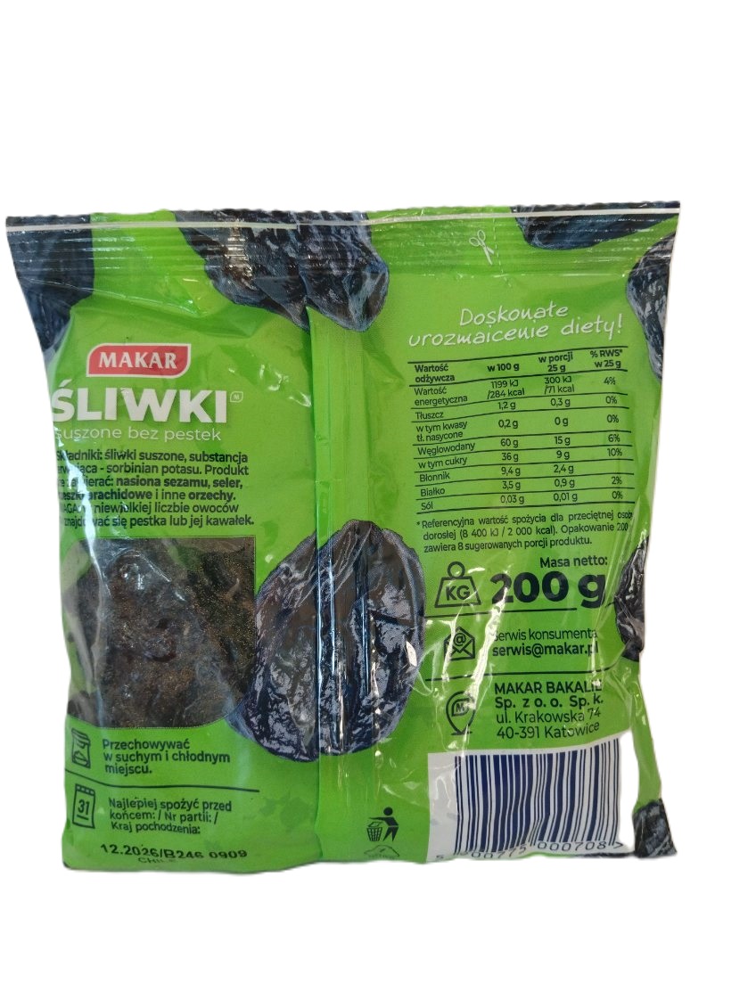 Naturalnie słodkie, miękkie i aromatyczne śliwki suszone bez pestki. Idealne jako szybka przekąska oraz dodatek do śniadań, deserów i dań wytrawnych. Śliwki suszone są bogatym źródłem polifenoli, które chronią komórki przed zniszczeniem i wspierają zdrowie kości. Obecność błonnika wspomaga trawienie, redukuje poziom cholesterolu i działa przeczyszczająco, co czyni je skutecznym rozwiązaniem przy zaparciach. Śliwki dostarczają także witaminy K oraz beta-karotenu, który poprawia nastrój i działa przeciwstarzeniowo.Wygodne opakowanie 200 g – w sam raz do codziennego użytku.